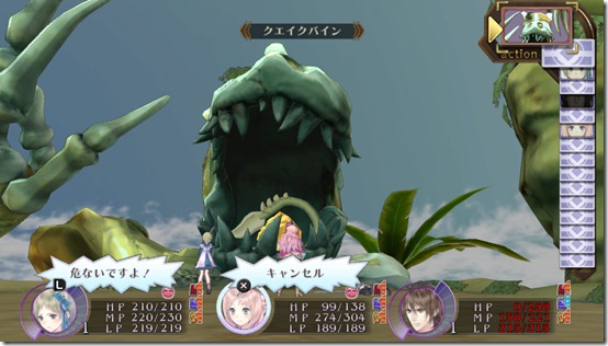 In terms of the battle system, you wouldn't believe how much better it is. Like I had said before, in Totori, they improved the battle system, by somewhat letting us know who's going next by looking at the turn order on the screen. In here however, there are blank boxes, and images of your characters and of the enemy. When it is your turn, you can choose a skill to use, and see how long the character will take to move again, as different moves have different waiting times. The characters still expand MP to use their moves, and they still have the "assist bar" and the "special move bar", and they are MUCH easier to see in this version. So, the battle system one-ups its predecessor.